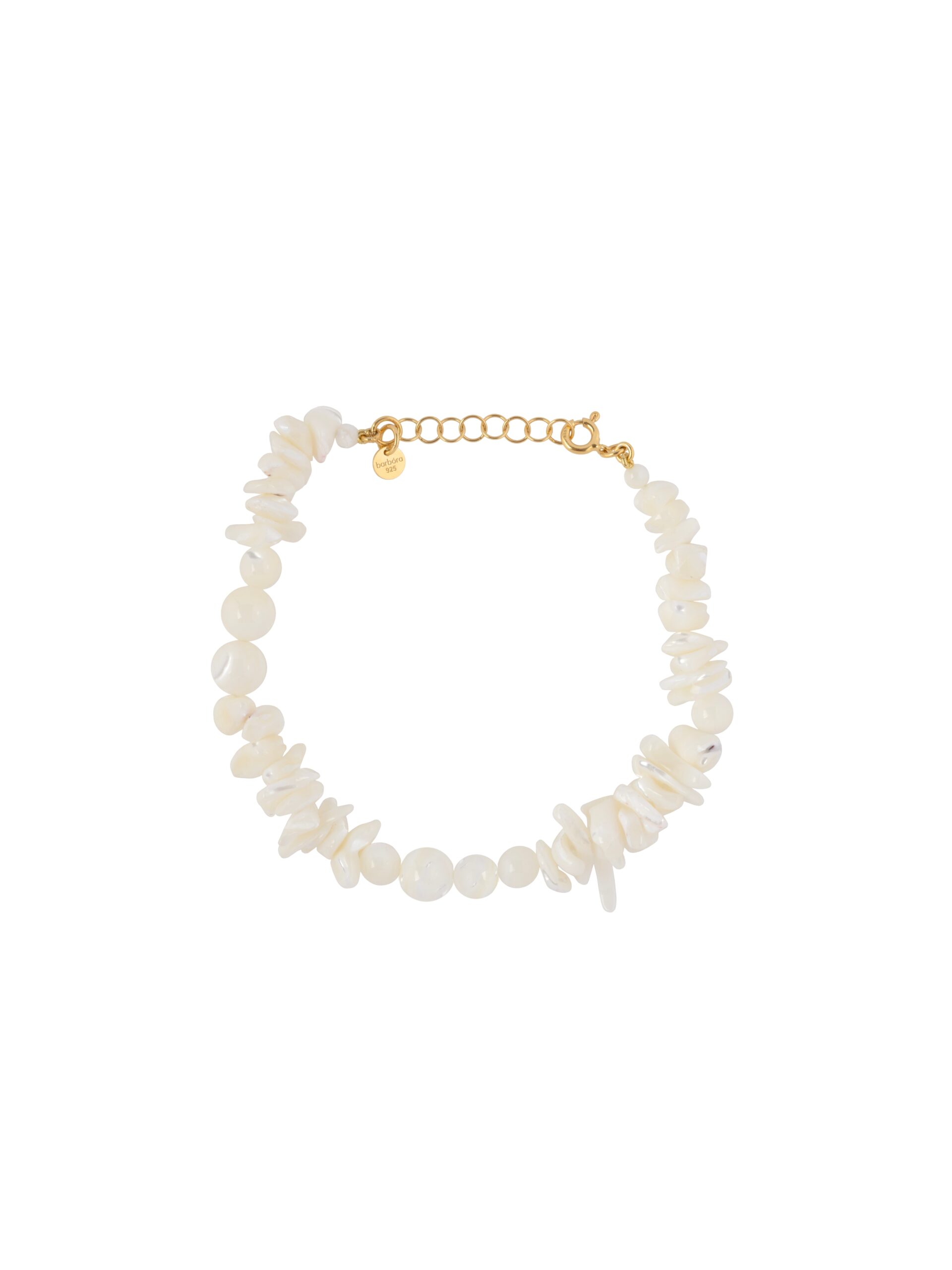 The Kallos Anklet is composed of smooth mother of pearl chips and beads, strung together with gentle irregularity — like seafoam caught in motion. Finished with a gold-plated silver clasp, it evokes balance between wildness and grace.