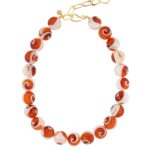 A continuous spiral of shell and coral-red resin beads, each one echoing the motion of the sea. The swirl — soft and elemental — speaks to life’s natural rhythm and quiet evolution. Bold yet fluid, sculptural yet grounded, this piece invites presence and flow.